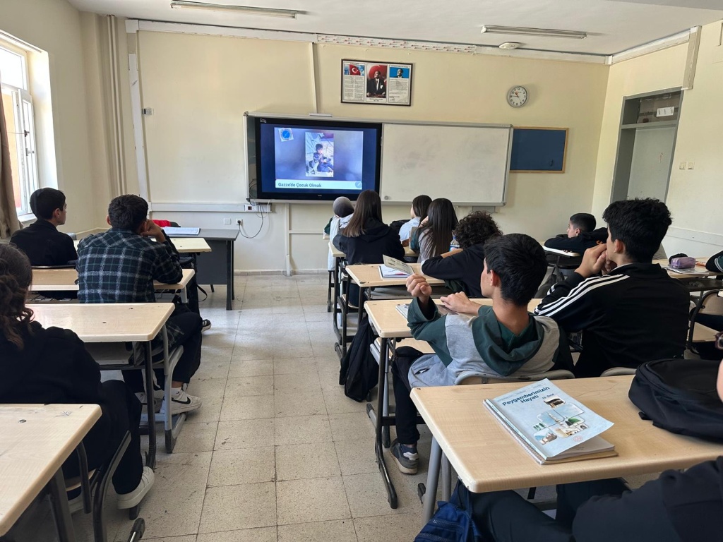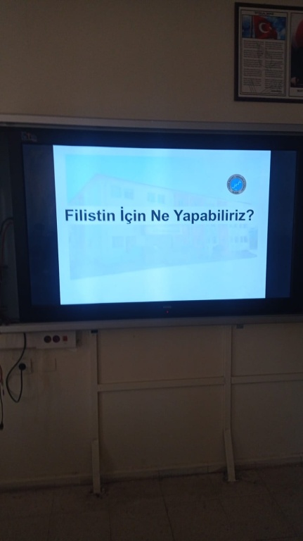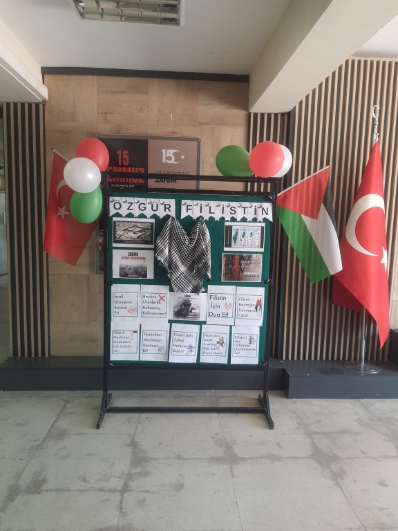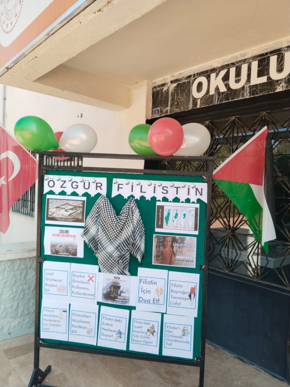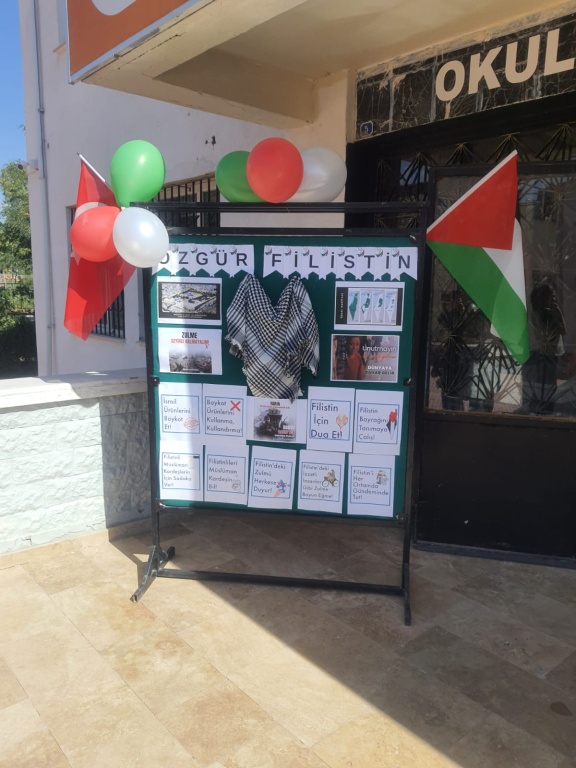 "Filistin Farkındalık Etkinlikleri "kapsamında Erdem ,Değer ,Eylem modeliyle bütünleştirecek, evlatlarımızın sorumluluk bilincinin eleştirel düşüncelerinin demoratik duyarlılılıklarının ve insan hakları bilincinin artması konulu Filistin etkinliğimizi okulumuzda coşkuyla gerçekleştirdik. Eba platformunda kendi hazırladığımız videoları, tüm öğrencilerimize eş zamanlı izlettik. Pano hazırladık.